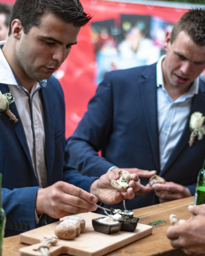 Na het bedenken van een hapje en een drankje is was het voor ons nog lang niet klaar. Nee, bij Sjoerd & Maaike hebben we de volledige organisatie op ons genomen. Van een prachtige aangeklede ruimte tot aan het eten, drinken en service alles werd door ons tot in de puntjes verzorgd. We kunnen hierover nog onwijs veel schrijven, maar de foto’s op deze pagina zeggen meer dan 1000 woorden. Dus laat je lekker onderdompelen door de mooie foto’s.